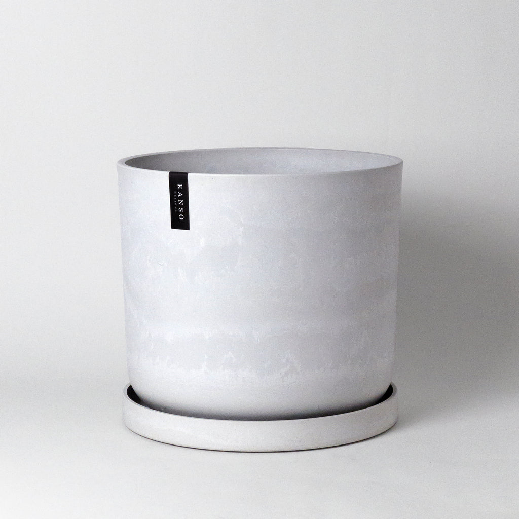 This trio of our signature stone planters is a perfect fit for medium to large size plants and ones needing transfer to a more durable home with more legroom. A timeless silhouette design with a white stone finish makes these pots a classic fit for indoor or outdoor use. These planters have been marbled with a natural white stone finish to give a natural concrete look. Made with recycled plastics, the finished product is combined with materials like natural stone and wood to completely change the nature of plastic into a green composite material. Each piece is the result of handcrafted finishes and each piece contains its own personality and unique details.