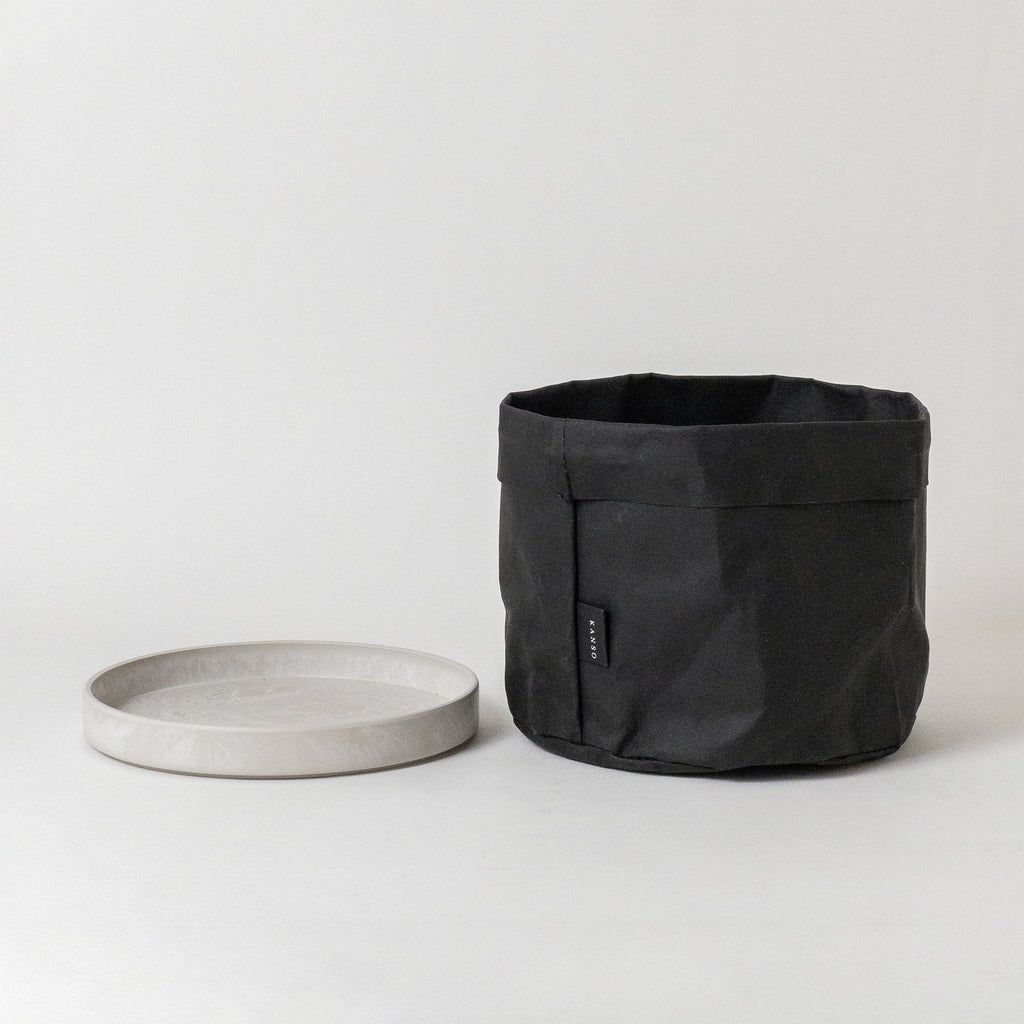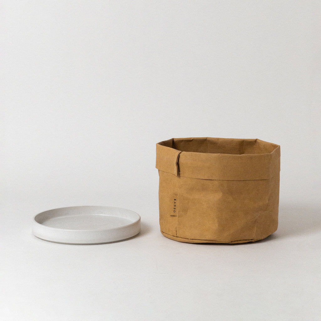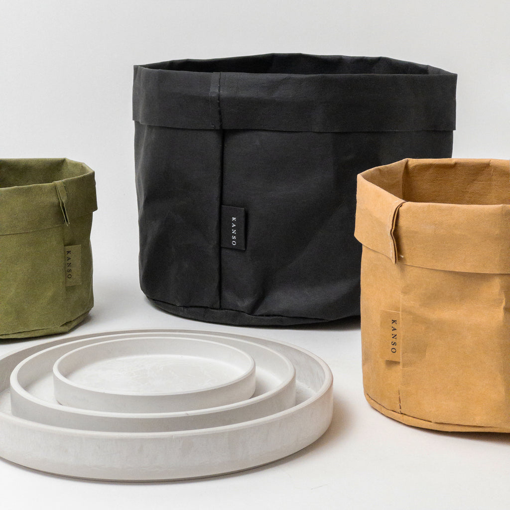 Versatile and flexible, these planters are made out of recycled Kraft paper material with detailed stitching on the side to hold a natural silhouette. Use as indoor planters or as storage baskets to add an eco-touch to your home. Because they do not contain an inner lining, they are also completely biodegradable if you do wish to shred it and scatter it in your compost bin. Each comes with a matching saucer to catch any leftover water moisture after watering.