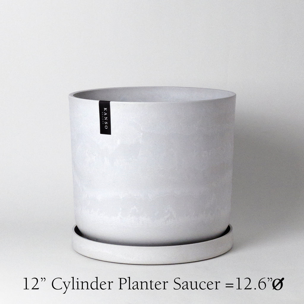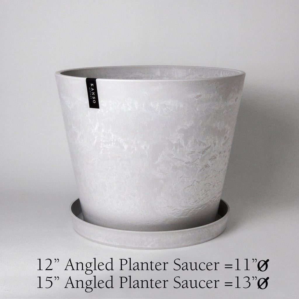 White stone planter saucer to catch any excess run-off from watering plants. Made with recycled plastics, the finished product is combined with materials like natural stone and wood to completely change the nature of plastic into a green composite material.